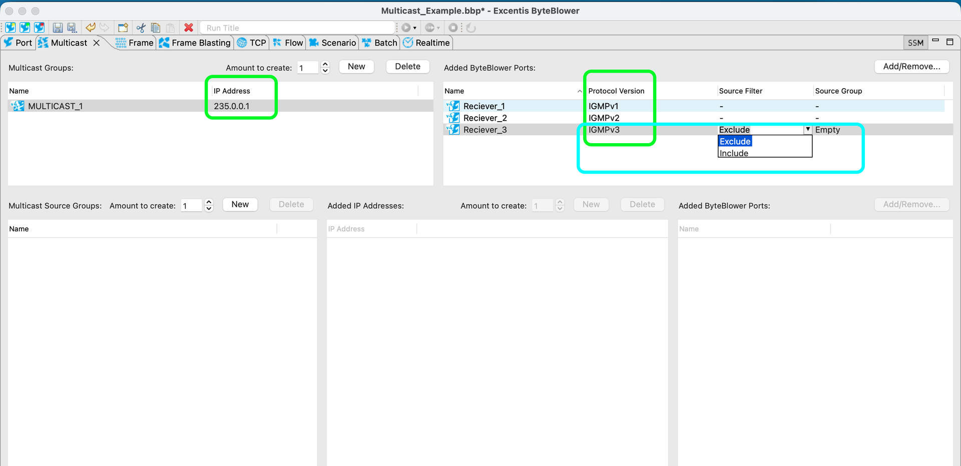 | IGMPv3 Hosts | For ports using source-specific multicast (IGMPv3 or MLDv2), the Source Filter (Include/Exclude) will apply to the Multicast Source Groups defined in the lower windows. So in addition to specifying the multicast group IP address they listening for traffic, these ports (IGMPv3) will also define from which source IP address(es) they allow that multicast traffic from. Include means that it only wants to receive traffic coming from the specified IP address list, exclude means that it wants to receive the multicast traffic from all source IP addresses except the specified IP addresses. For specifying the source IP address(es), you have the choice of raw IP addresses or the IP addresses from the selected ByteBlower Ports. In the example below, Reciever_3 will listen for/receive traffic for multicast address 235.0.0.1, only from raw IP address 1.2.3.4 and from the IP of Sender_2.