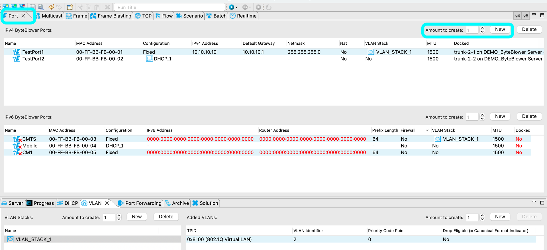 Port Tab | The Port Tab. Here you will create IPv4 and/or IPv6 addresses. These will be the transmitters/ receivers of the test traffic configured in the later steps. In this tab, you can configure the following: