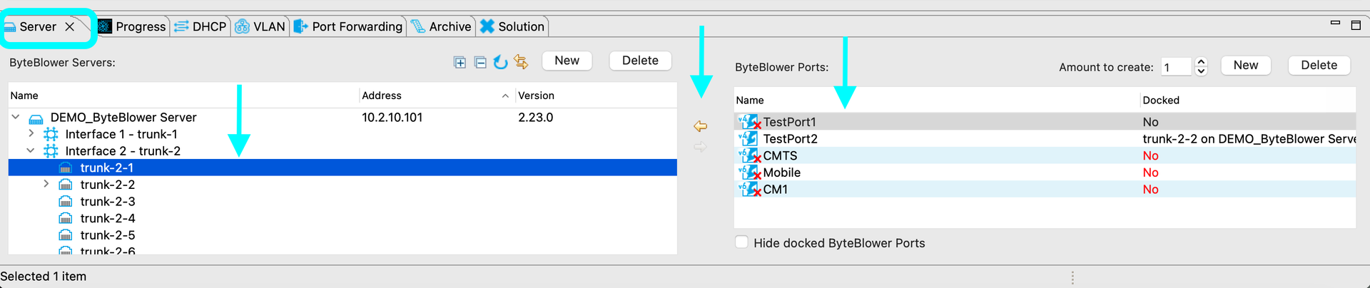 Docking the Ports | To Dock the ports means: to assign the physical interface on the ByteBlower system the port will send/receive the traffic through. Non- Trunk interfaces are the traffic interfaces that are directly connected to the server (usually the NSI side). Trunk Interfaces are related to an Excentis purchased switch, used to multiplex the traffic.